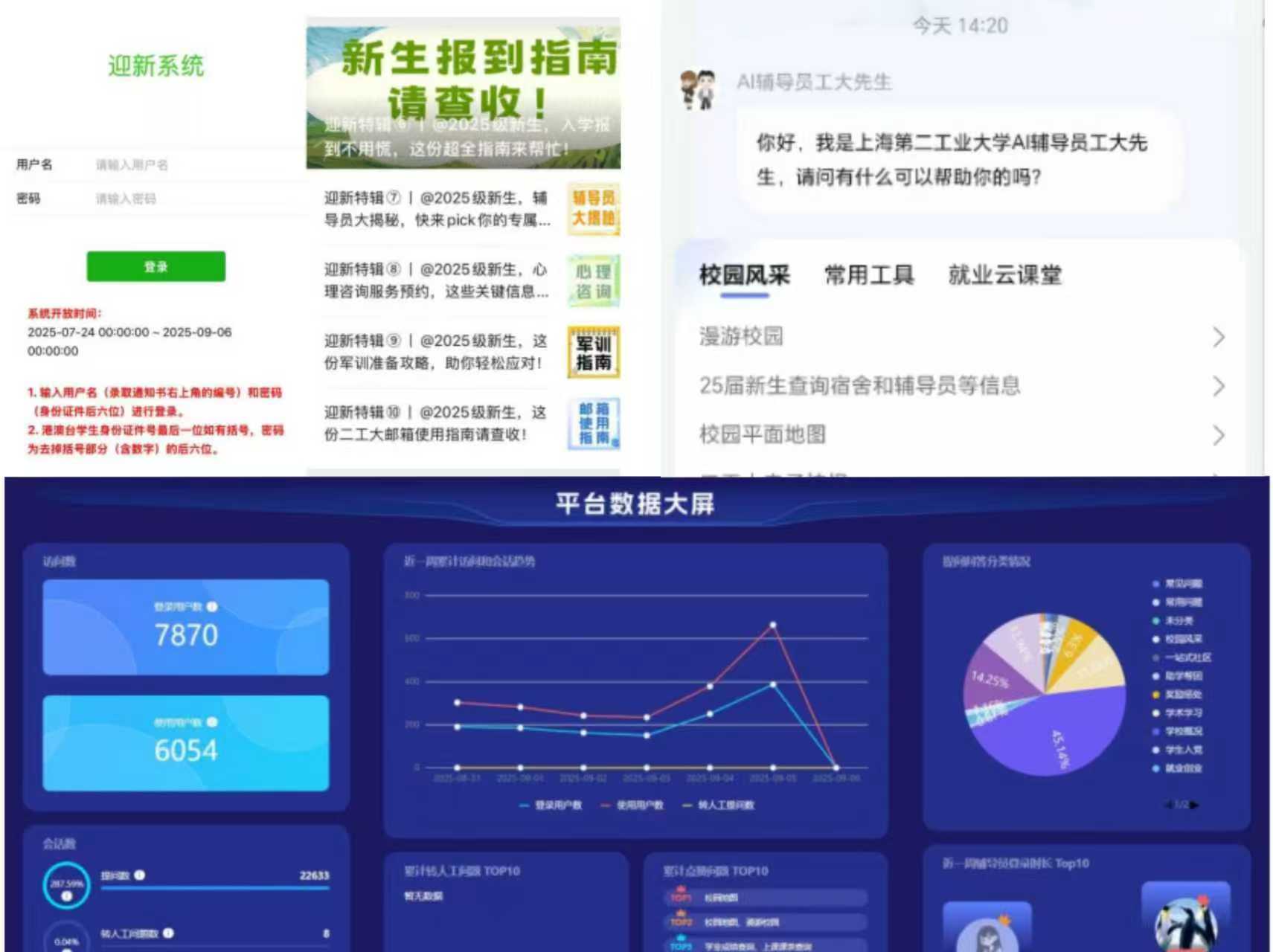 AI赋能助力迎新智慧升级。为助力新生尽早融入大学生活,今年迎新工作融合AI技术创新,为新生打造全方位、智能化入学体验。迎新系统实现新生全覆盖,辅导员主动靠前服务,建立官方班级群,答疑解惑。我校AI 辅导员“工大先生”首次参与迎新工作,精准匹配并满足新生多样化需求,既高效响应新生关切,又有效填补辅导员工作的时间间隙,实现“全天候、无间断”答疑服务。迎新工作全面升级了数字化智能报到系统,为新生带来高效、便捷的入学体验。实时数据,动态更新各学院报到人数,直观感受与新同学的“同频共振”。